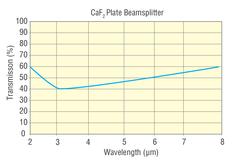 CaF2 beamsplitters are an ideal material for applications in the IR region. In general, CaF2 has a transmission above 90% between 0.25 µm and 7 µm, making it a great choice for deep UV to infrared applications. In addition, with its low absorption and high damage threshold, CaF2 is commonly used for excimer laser applications.