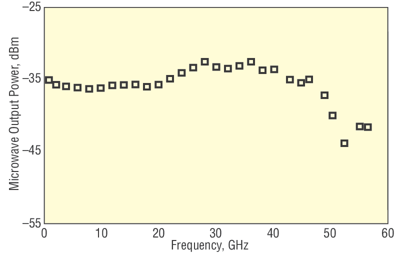 Typical frequency response of Model 1014. Input power was 0.45 mW at 1.06 µm. Measurement accuracy is ±1.5 dB up to 40 GHz, and ±3.5 dB from 40 to 60 GHz.