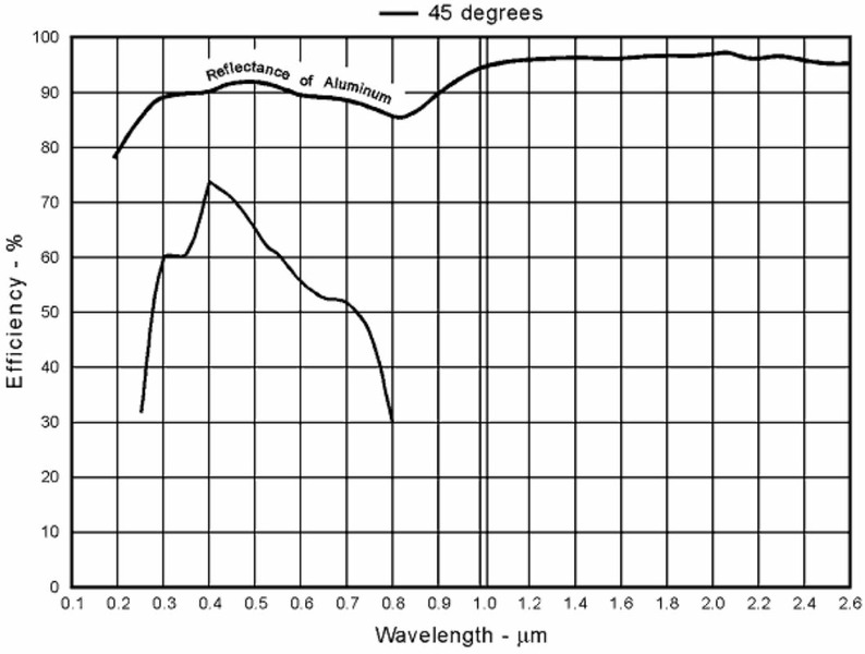 Holographic diffraction gratings can have very high diffraction efficiency, even above that of flat aluminum reflectors, at the design wavelengths and orientation. Diffraction efficiency is highly dependent on the polarization state. Planar holographic gratings typically feature narrower spectral bandwidth, and have their peak efficiency at a shorter wavelength for P-polarization compared to S-polarization. For laser cavity applications this property may be used to feed light from a specifically chosen wavelength and polarization state back into the laser gain medium to control the output of the laser. Conversely, applications such as spectrometers designed to operate using unpolarized light may require the use of two gratings in conjunction with a polarizing beamsplitter to obtain optimum results.
