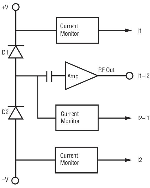 In addition to the RF output, these balanced photoreceivers have three low-frequency monitor outputs. These monitor outputs can be used to help align light onto the photodiodes, perform low frequency diagnostics, and make manually equalizing the power between the signal and reference beams easier. The monitor outputs have SMB connectors, and an SMB-to-BNC cable is provided with the photoreceiver. All three monitor outputs have a transimpedance gain of 10 V/mA. The bandwidth of the I2 - I1 output is DC to 15 kHz, and the bandwidth of the I1 and I2 outputs is DC to 100 kHz.