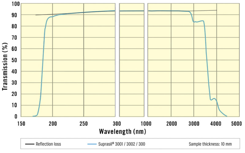 These lenses feature Heraeus Suprasil® 300 high‑purity synthetic fused silica substrates. Suprasil 300 is manufactured by flame hydrolysis and is characterized by ultra‑low metallic impurities (<1 ppm) and an exceptionally low OH content (<1 ppm), resulting in no absorption bands from the visible to the infrared spectral region. This significantly reduces bulk absorption and minimizes the risk of internal damage under high‑energy laser exposure. For more information, refer to the optical material tech note.