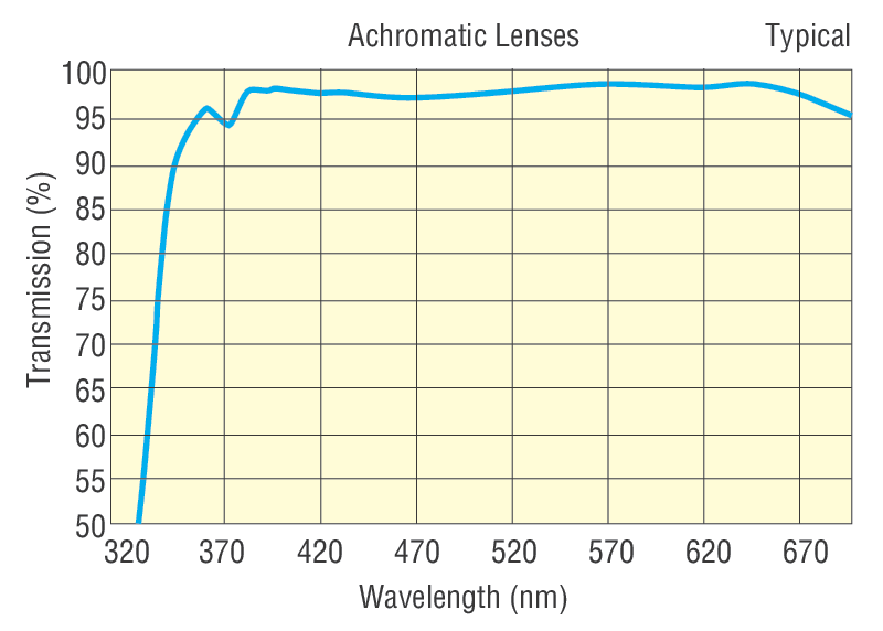 Our UV-VIS antireflection coated achromatic lenses offer near diffraction limited performance from 345-700 nm making them ideal for fluorescence microscopy, or Nd:YAG laser applications.