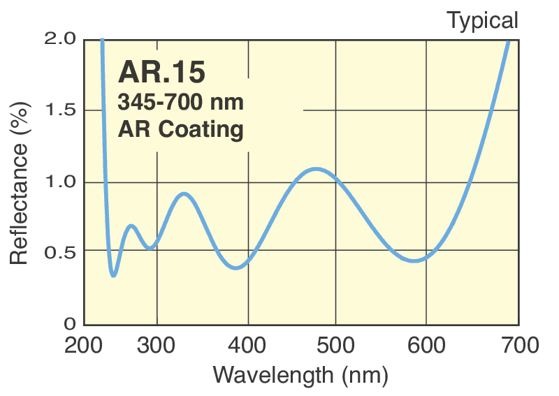 Our AR.15 broadband multilayer antireflection coating markedly improves the transmission efficiency of these lenses by reducing surface reflections over a 225-700 nm wavelength range. This coating enables use with any or all of the 2nd, 3rd, and 4th harmonic Nd:YAG wavelengths, or for use in UV fluorescence imaging applications.
