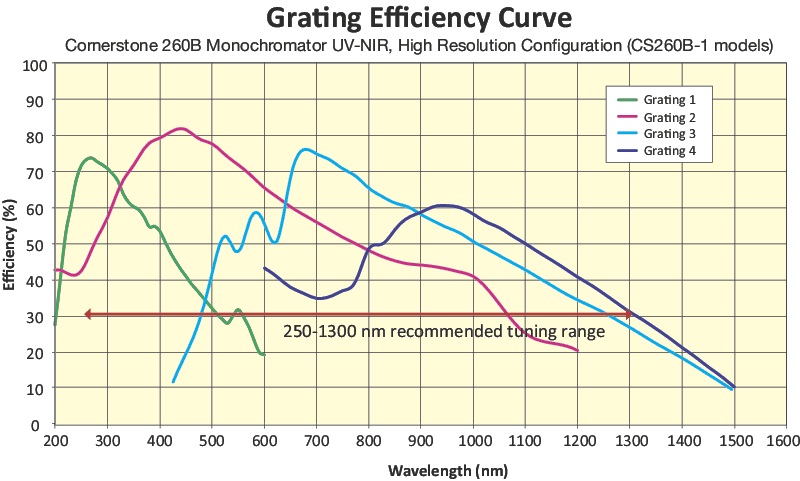 CS260B-1 UV-NIR High Resolution Quad models use four ruled gratings that have high line densities, which correspond to higher resolution- refer to our tutorial for more information. The grating efficiency curves are relative (not absolute) calculations and should only be used as a guide to approximate actual instrument performance.