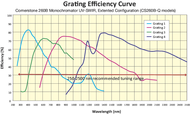 CS260B-Q UV-SWIR Extended Range models use four ruled gratings to provide the widest spectral range option- refer to our tutorial for more information. The grating efficiency curves are relative (not absolute) calculations and should only be used as a guide to approximate actual instrument performance.