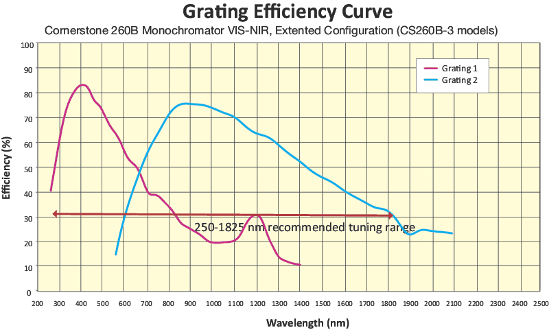 CS260B-3 VIS-IR models use two ruled gratings that are better suited for IR applications- refer to our tutorial for more information. The grating efficiency curves are relative (not absolute) calculations and should only be used as a guide to approximate actual instrument performance.