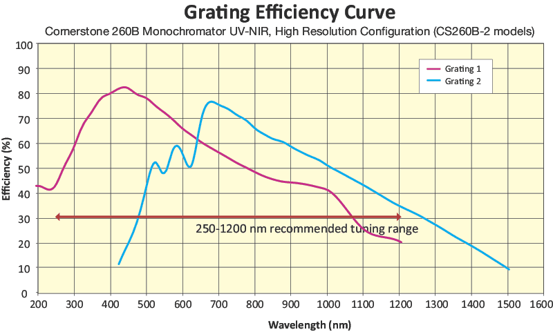 CS260B-2 UV-NIR High Resolution Dual models use two ruled gratings that have high line densities, which correspond to higher resolution- refer to our tutorial for more information. The grating efficiency curves are relative (not absolute) calculations and should only be used as a guide to approximate actual instrument performance.