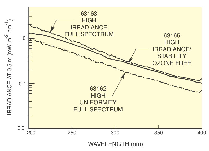 Choose a lamp first by the shortest wavelength you need. If you aren't working below 180 nm, choose an ozone free lamp. The high irradiance lamps have a very small, 0.5 mm, arc for producing both the highest irradiance and highest radiance, but they are also more expensive than the high uniformity lamps. Model 63163 is no longer available for ordering, though the graph is retained for legacy support reference.