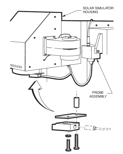 The figure to the left shows a diagram of the 68951 Exposure System's detection head picking off a portion of the light output from a 1000 W Oriel® solar simulator. A fiber probe, mounted to the simulator's output lens assembly, samples a small segment of the uniform portion of the output beam and feeds it to the Si detector connected to the digital exposure controller.