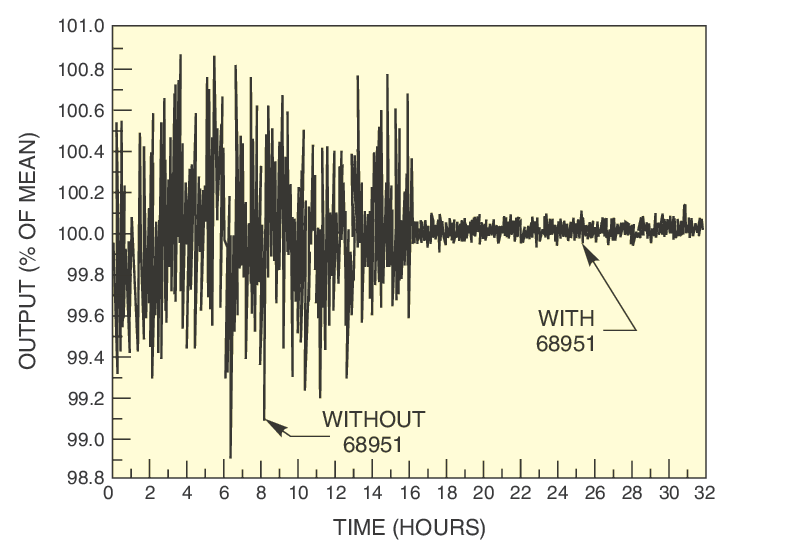 Our solar simulators have highly regulated power supplies to operate the lamps at constant power or current. However, with aging of the lamp and variables such as electrode erosion, gas absorption or desorption, the light output can change. These changes tend to be wavelength dependent. The 68951 Digital Exposure System works with the power supply to compensate for these changes and ensure a stable, long-term output. It consists of a light sensing head, a controller, and a fiber optic probe. The silicon based light sensor monitors part of the light source output, and the controller constantly compares the recorded signal to the set level and changes the power supply output accordingly to keep the measured signal at the set level. Automatic detector gain setting allows the unit to work with 300 to 1600 W solar simulator models. Refer to the figure to the right for an example of the effect of on the light output of a 1.0 kW Solar Simulator.