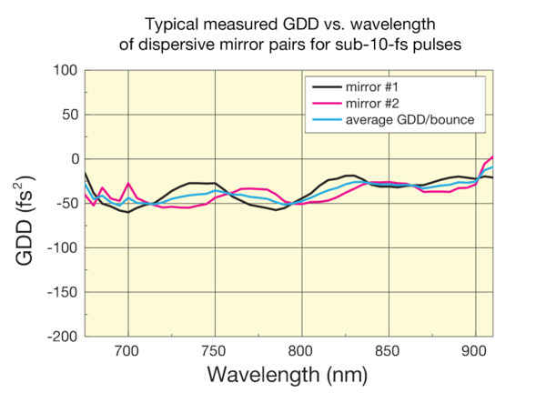When transmitting an ultrashort pulse laser beam through a number of optical components, the pulse will spread and become chirped. This matched pair of mirrors are the solution to compensate for pulse broadening effects. These mirrors provide a negative group delay dispersion (-45 fs2 at 800 nm per bounce) to the incoming laser beam with every bounce off the surface. By setting up a two or three mirror configuration, the laser beam can bounce back and forth between the mirrors many times to compensate for pulse dispersion effects. These mirrors can be mounted into Newport's patented clear quadrant mounts - such as SN100C-F2K or U100-A2K - to create the closest separation between two mirrors to allow for a large number of bounces between elements. Refer to our application notes Dispersion Compensation Using Chirped Mirrors for more details.