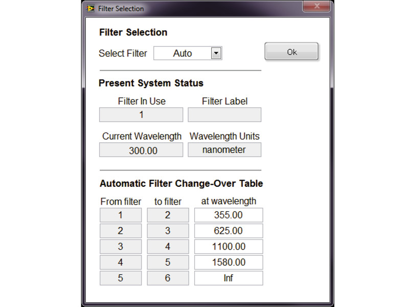 The USFW-100 model is powered and controlled through its related monochromators and spectrographs. Control is achieved through use of the Mono Utility, Mono Term or optional TracQ Basic software. A filter may also be selected through use of the optional