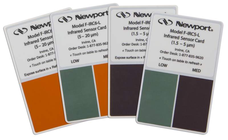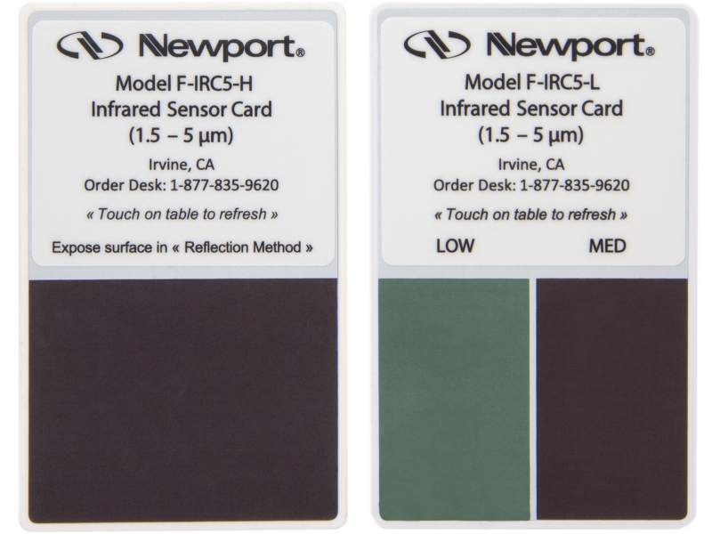 Low power cards can detect down to 0.2 W/cm2 with one sensor area for low powers and a second sensor area for medium powers. High power cards have a damage threshold up to 120 W/cm2. The high power sensor card has a larger area and can be used conventionally by directly exposing the sensitive area to mid-IR radiation. For high power densities, the back of the sensitive area (uncolored) is exposed to the radiation and the sensitive area on the front of the card changes color.