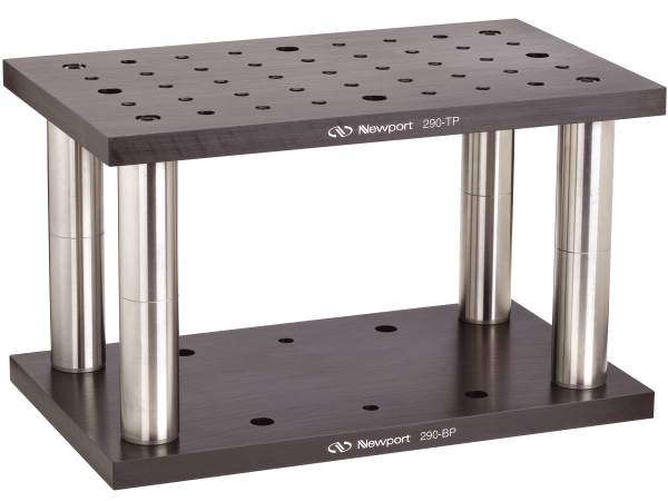 Model 290-TP mounting plate has an array of tapped and clearance mounting holes for attaching components. 290-BP base plate has two rows of clearance holes for tie-down to tables or magnetic bases. Both are used in Fixed Height Platforms assembly as top and base plates.