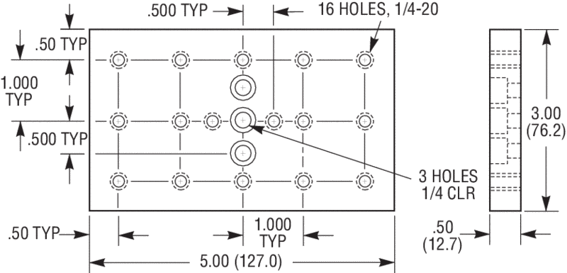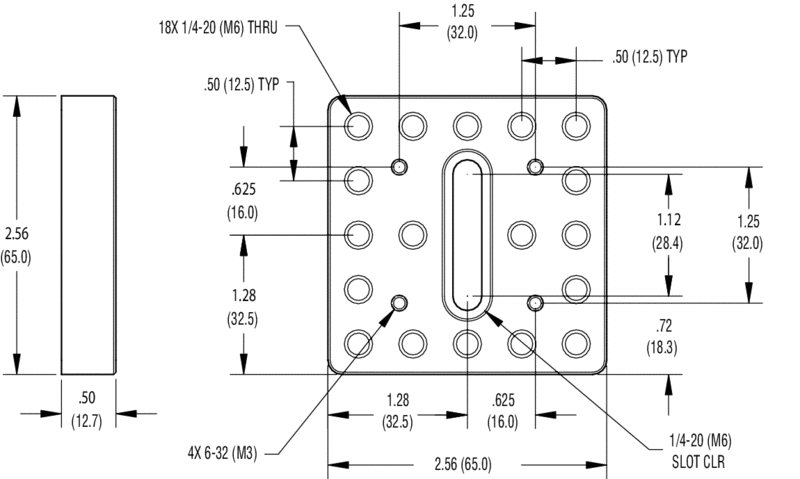 The Model 38 Platform is an anodized aluminum plate with an array of threaded 1/4-20 holes in 1-in. and 0.5-in. hole patterns, along with counter bored through holes, on its 3.0 in. x 5.0 in. surface (76.2 mm x 127 mm). This adaptor plate is particularly useful for mounting English components on to a metric optical table, or to provide a larger mounting surface to smaller stages or base plates. The model 38 is made from black anodized aluminum alloy. If a larger mounting platform is needed, we suggest using Model 290-TP. Model 39 is an adjustable version of this platform which is also available.