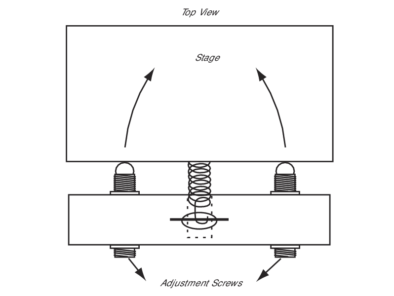 Kinematic Device Alignment Stages combine the capabilities of multiple, stacked translation stages into a single stage with multiple actuators. These stages are designed to align a device or optic, such as an acousto-optic modulator, to a beam path, avoiding the added wobble of combining components for multi-axis positioning. These stages have all degrees of freedom needed to align one optical axis to another. The five-axis stages provide additional control of the focus and the six-axis stage provides roll. Each degree of freedom has one actuator for motion, such that two actuators provide translation when moved equal amounts, while one actuator's motion provides the tilt about the bisecting axis. Rotations of the mounting plate around its center, then, arise from turning two actuator screws in opposite directions.