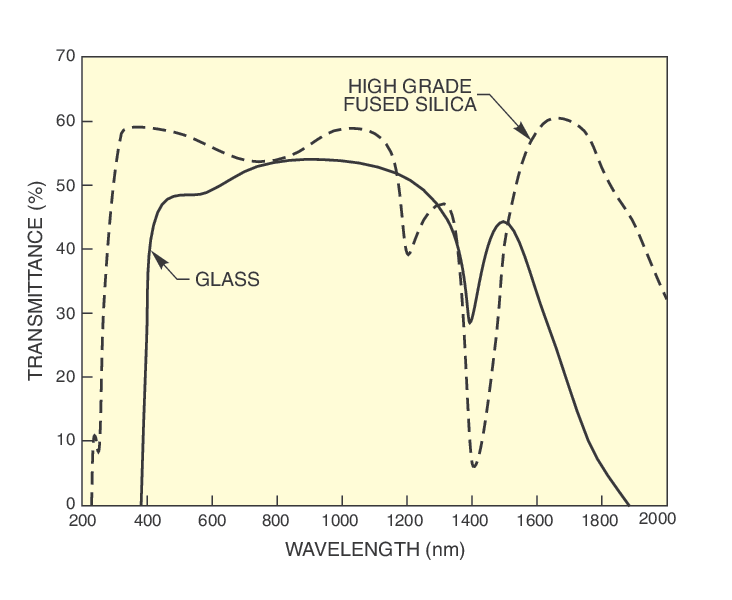 Fiber bundles with two different core materials are offered. A high grade fused silica core transmits nearly all of the radiation emitted from an arc lamp (particularly ozone free types), with transmittance beginning down at 260 nm and continuing to 2200 nm.