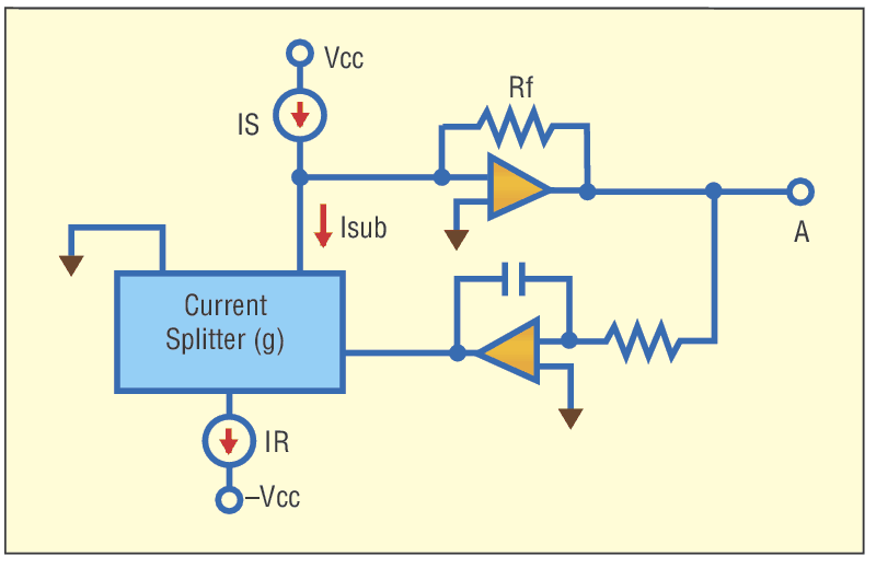 The feedback loop in the Nirvana™ photoreceiver splits the reference photodetector current, IR, to generate the cancellation photocurrent, Isub. When the DC value of Isub equals the signal current, IS, the laser-amplitude noise is cancelled.