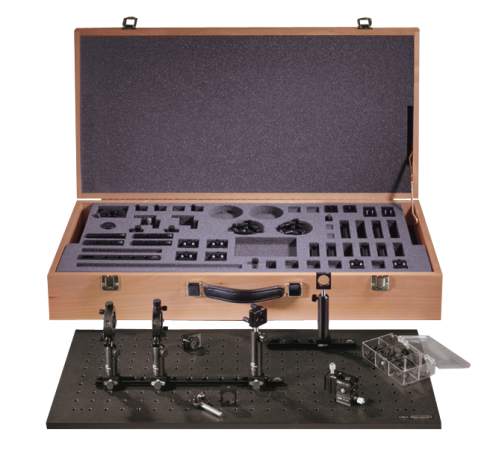 The Model MK-1 Set contains an assortment of our popular smaller components, chosen for building complete systems commonly used in optics applications, such as telescopes or microscopes. With the included 12 in. x 24 in. (300 mm x 600 mm) breadboard for mounting the various positioning elements, a set-up is easily relocated as a single unit without needing realignment. Other components include miniature dovetail stages, optical rails, lens mounts, and a filter clamp. (Specific optics components such as lenses are available separately.) All components are kept in a specially insulated, latched wooden case with a handle.