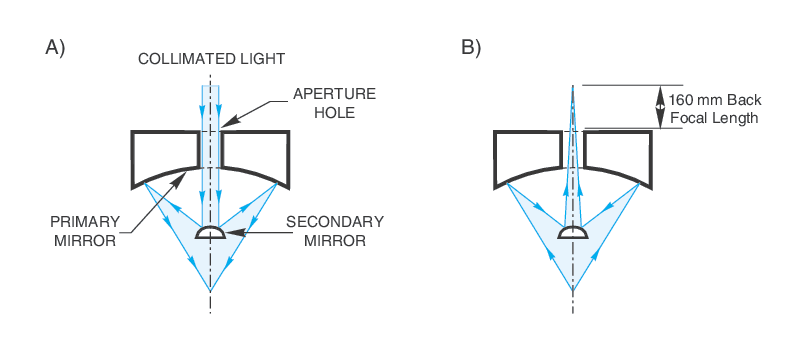 In a typical focusing application, collimated light passes through the aperture hole in the primary mirror to the secondary mirror. The secondary mirror then reflects and diverges the beam to fill the primary mirror. Finally, the primary mirror focuses the beam to a small spot called the Object Plane or Focal Point. This dual mirror configuration is known as a reverse Cassegrain (primary mirror collects or focuses light from or to a point, and the secondary mirror interacts with collimated light, the opposite of a traditional Cassegrain telescope). These objectives follow the Schwarzschild design. Accordingly, they have zero chromatic aberration, and negligible coma, spherical, and astigmatic aberrations.