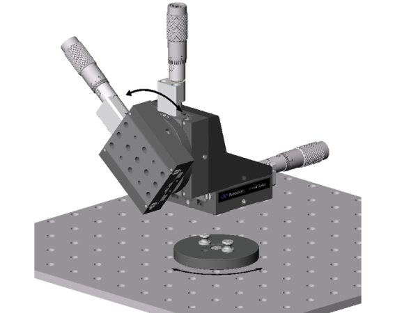 The black anodized aluminum Peg Rotation Base comes with a joining peg that goes through the center of the base and mounts to 1/4-20 (or M6) threaded holes in an optical breadboard or table. The base rotates around the peg freely and can be locked in position by tightening two 8-32 (or M4) set screws located on the circumference of the base. Shown here is 460P Series ball bearing or 460PD Series dovetail linear stages to be rotated to any angle and then locked in position.