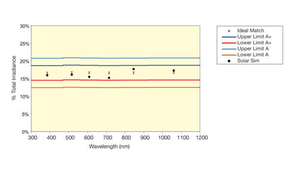 Spectral match is indicated by the first letter in the solar simulators class rating. An ideal spectral match for a solar simulator is based on the percentage of the integrated light intensity in 6 spectral ranges. A solar simulator with a Class A+ spectral match may not deviate more than 0.875 to 1.125 times the ideal percentage in each spectral range. Spectral match for all Newport Solaris solar simulator models installed with the AM 1.5G spectral correction filter is shown to meet IEC Class A+ requirements. For more information about these solar simulator standards, please see our "Solar Simulator Standards — Definitions & Comparisons" technical note.