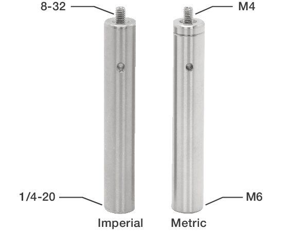 SP Series Optical Mounting Posts are precision ground 0.5 in. (12.7 mm) diameter stainless steel optical posts. Each post has an 8-32 (or M4 for metric versions) tapped hole in one end and a 1/4-20 (M6) tapped hole in the other end. Each optical mounting post is supplied with a 8-32 (M4) double-ended set screw for joining posts together to create customizable lengths. Different ends of the posts can also be connected with TA-8Q20-10 (TA-M4M6-10) thread adapters.