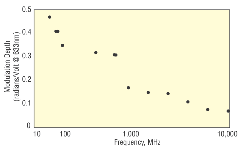 Typical modulation depth of our resonant phase modulators plotted as a function of modulator frequency for three families of modulators.