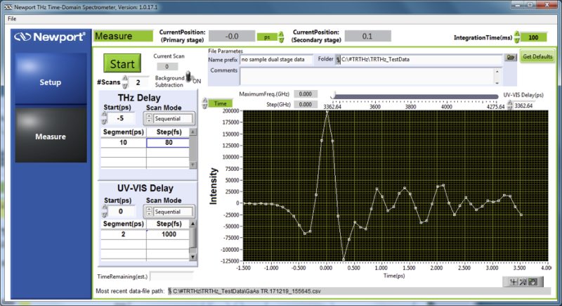 The THz-TDS comes with easy-to-use LabVIEW based software designed to speed up and simplify data collection with free updates for the lifetime of the product. The software seamlessly integrates the many devices used in THz-TDS, such as the motion stage(s), detectors, and optical chopper. The software features a Setup tab, where you can optimize the signal level, delay line zero, chopper phase, and more on a real-time basis. After this is complete, data acquisition can be started on the Measure tab. There are options for setting up the scan range and step size for both stages, as well as number of averages and selection of random or linear scan. Data can be acquired in a stepped or continuously swept mode in order to decrease scan time. The estimated time remaining for the scan is estimated initially and updates as the data is acquired. Every scan is saved to disk, so that in case of a stopped scan, data is not lost. Saved data can also be reloaded for later viewing and a copy of the software can easily be run in data viewing mode on an office or home computer. The standard output file type is .csv with headers.