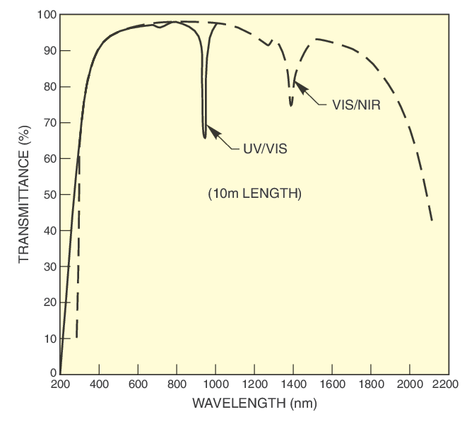 Two different materials are used in the core construction of these light guides to offer two different transmittance ranges. UV/VIS, or ultraviolet to visible fibers have a useable wavelength range of 250 to 1150 nm. VIS/NIR, or visible to near-infrared fibers are suitable for wavelength transmittance from 400 to 2100 nm.