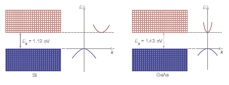 Figure 1. The E-k diagrams for Si, an indirect-bandgap semiconductor, and GaAs, a direct-bandgap semiconductor.
