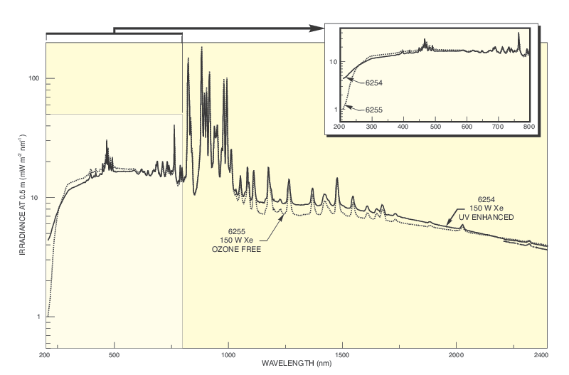 The 6254 150 W UV Enhanced Xe lamp is a useful option for those who need the visible to NIR performance of a Xe lamp without the drop in UV light output typical of a Xe arc lamp.