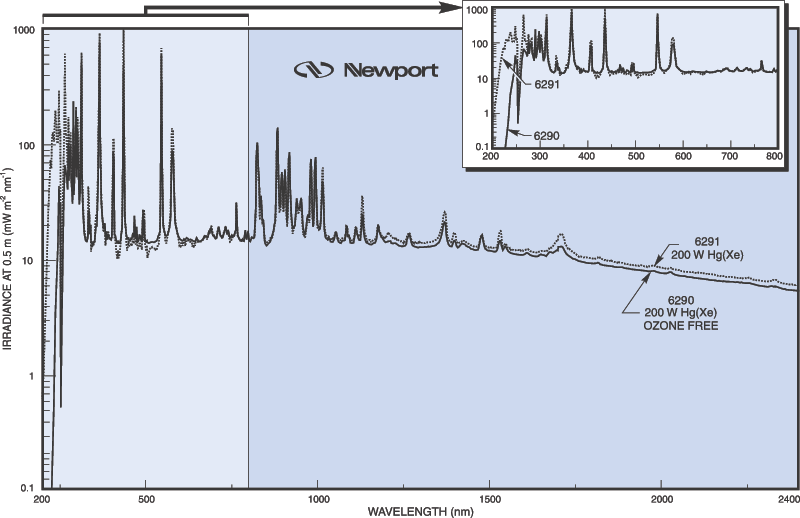 Mercury-Xenon arc lamps contain a tightly controlled mixture of xenon gas and mercury given them the combined UV spectral lines of an Hg lamp with the IR spectral lines of a Xe lamp.