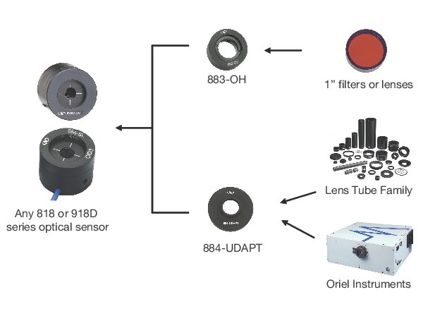 884-UDAPT is a universal adapter to make Newport's 818 and 918D series photodiode sensors compatible with the Oriel 1.5 inch Series flanges and Newport's 1 inch Lens Tube family.