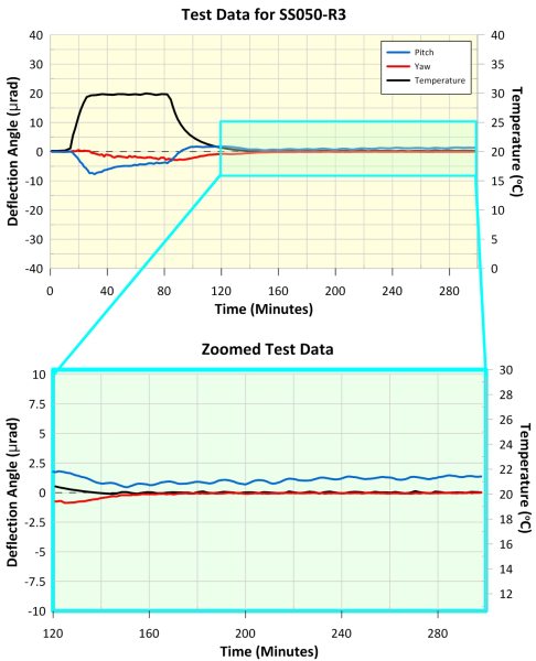 The maximum deflection of the SS050-R3 mirror mount during peak temperature was 8 µrad in pitch and 3 µrad in yaw, and the shift in reflected beam position after temperature cycling was < 2 µrad in pitch and < 1 µrad in yaw. This demonstrates the mount's excellent thermal properties. Further details are shown in the accompanying graphs.