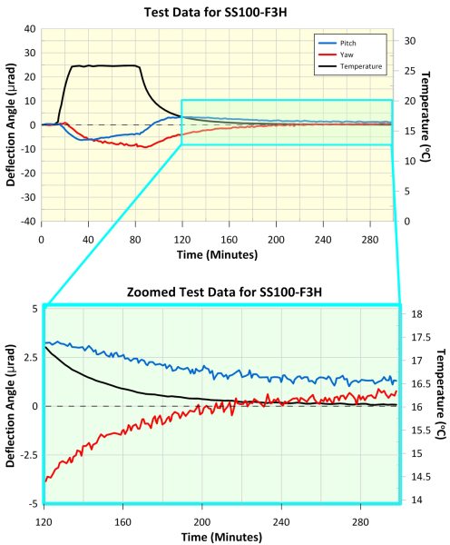 The maximum deflection of the SS100-F3H mirror mount during peak temperature was 7 µrad in pitch and 10 µrad in yaw, and the shift in reflected beam position after temperature cycling was < 2 µrad in pitch and < 1 µrad in yaw. This demonstrates the mount's excellent thermal properties. Further details are shown in the accompanying graphs.