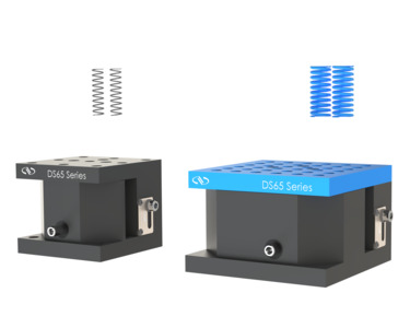 In this example, a DS series vertical linear stage is customized for increased spring stiffness to provide strong restoring force and maintain alignment under inverted, heavy-load configurations. It also incorporates a larger mounting platform for improved versatility.